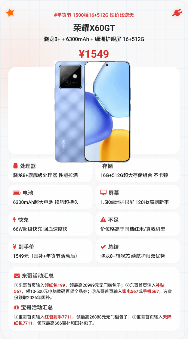 1500元档均衡实用首选,1499元16+512G存储,搭载第三代骁龙7S处理器,安兔兔跑分约80万,日常使用、轻度游戏完全够用,512G存储彻底告别内存焦虑。核心亮点是1.5K高光护眼屏(120Hz高刷+3840Hz高频调光),显示细腻且护眼,还有同价位罕见的IP68防尘防水,耐用性拉满。
